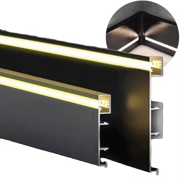 Customization: Fully customizable in length to fit any room size, with options for tailored colors (anodized, powder-coated, brushed finishes) and LED wattage to meet specific lighting needs. The skirting board can also be paired with diffusers for softer, glare-free illumination.